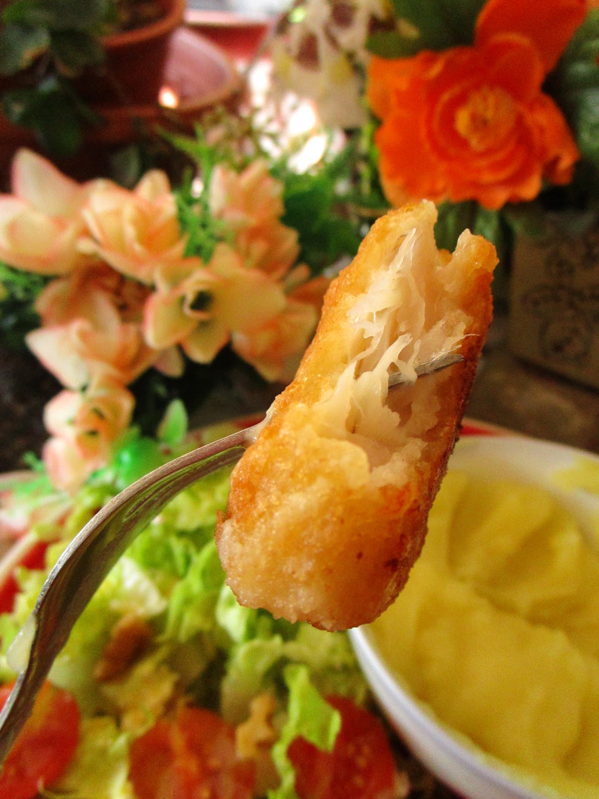 Lo he acompañado con 3 nuggets de pescado (Lidl); fritos 4 minutos por lado en poco aceite; escurridos en papel de cocina antes de llevarlos a la mesa. (Estos nuggets tienen un sabor exquisito, llevan un 50 % de abadejo de Alaska; un pescado que me encanta, pero que es difícil encontrarlo en mi zona; y van rellenos de queso Maasdam; se que tienen muchas calorías; pero... un día es un día :)