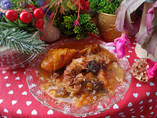 MENÚ REAL PARA LOS 3 REYES MAGOS: Copa cremosa de puré de patata con bonito en escabeche. Pollo rehogado con ciruelas. POSTRE: Pastelito de queso y frutos rojos