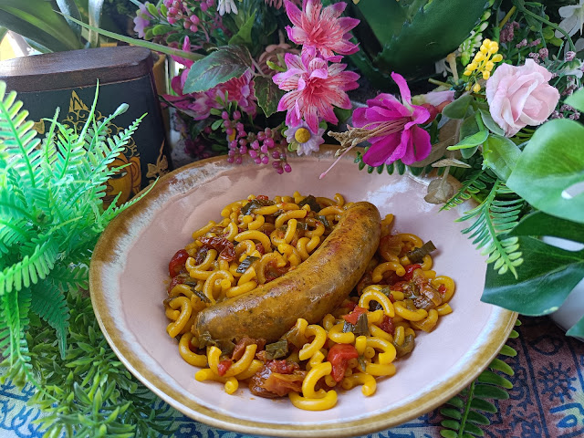 FIDEOS CON BUTIFARRA (Salchicha gruesa) POSTRE: Macedonia de pera, banana y Kiwi con miel de azahar